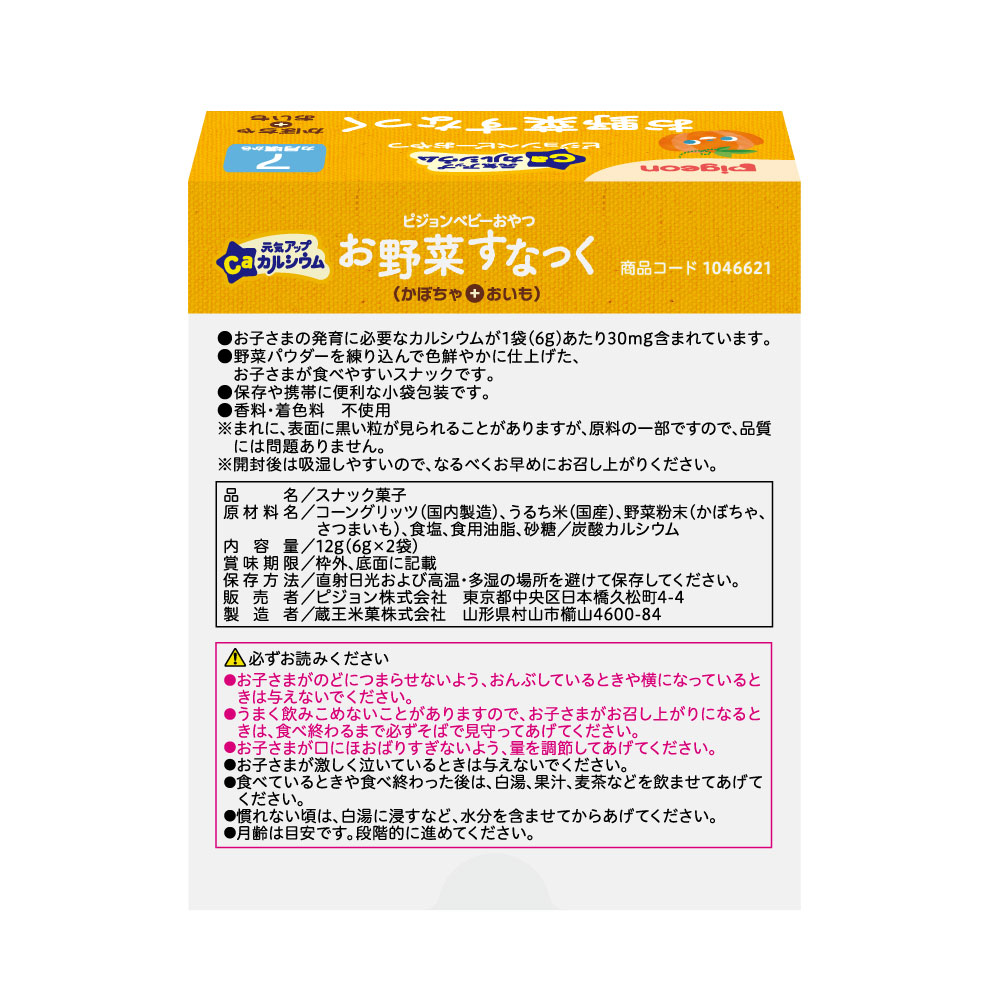 | 原材料名 | コーングリッツ(国内製造)、うるち米(国産)、野菜粉末(かぼちゃ、さつまいも)、食塩、食用油脂、砂糖/炭酸カルシウム |
