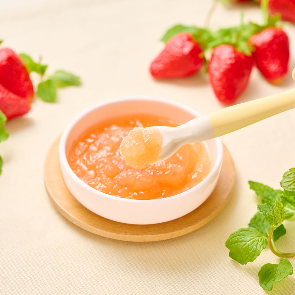 | 原材料名 | すりおろしりんご(国内製造)、りんご濃縮果汁、いちご濃縮果汁(とちおとめ100%)、寒天/pH調整剤、ゲル化剤(増粘多糖類)、乳化剤 |