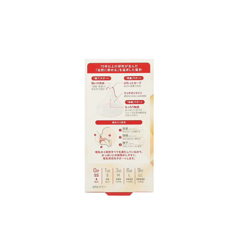 そのため、「母乳実感®」乳首は、赤ちゃんの発達に合わせた適切な量が飲めるように、乳首の吸い穴の形や大きさを変えて6サイズから選べるようにしています。